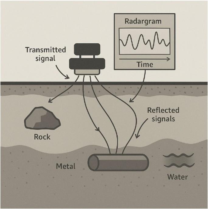 O funcionamento do GPR baseia-se na emissão de pulsos eletromagnéticos por uma antena transmissora. Esses pulsos se propagam no terreno e, ao encontrarem contrastes nas propriedades dos materiais como permissividade dielétrica, condutividade elétrica e permeabilidade magnética parte do sinal retorna à superfície, onde é captado pela antena receptora. O sistema registra principalmente o tempo de percurso e a intensidade do sinal refletido, permitindo a geração de perfis que ajudam a estimar a profundidade e a geometria dos alvos detectados.
